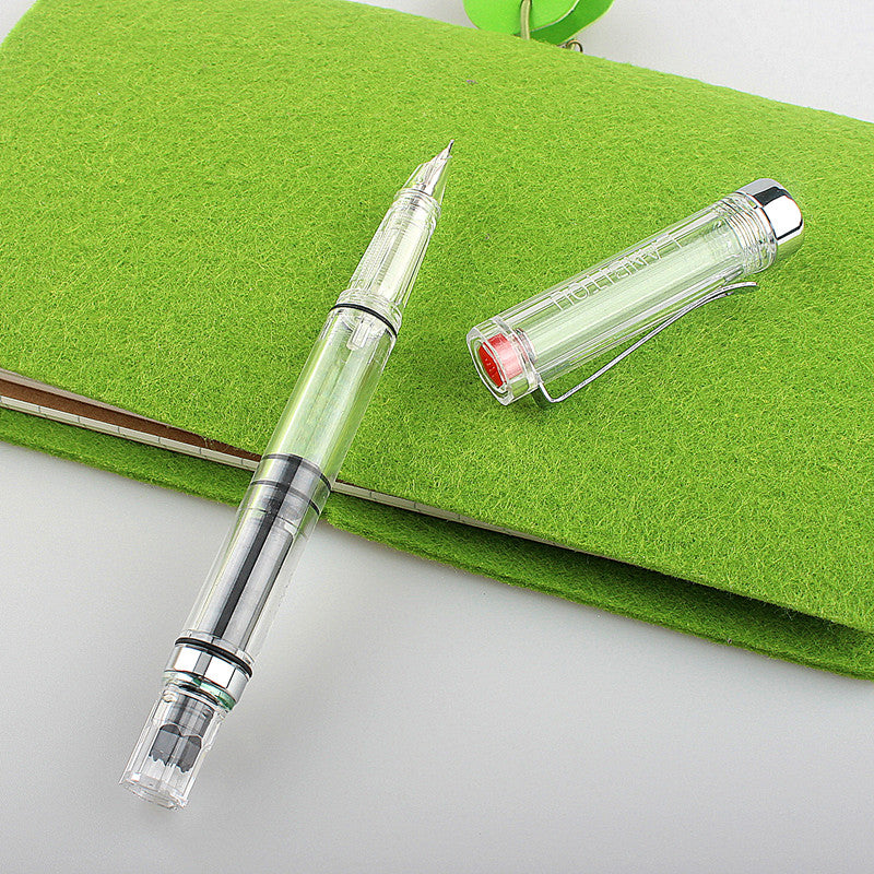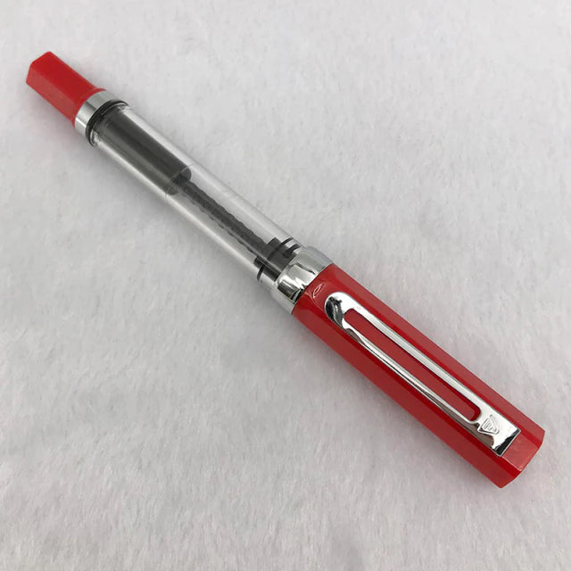 The pen is equipped with a piston filling system, designed for use with bottled ink, offering an easy and refillable experience.