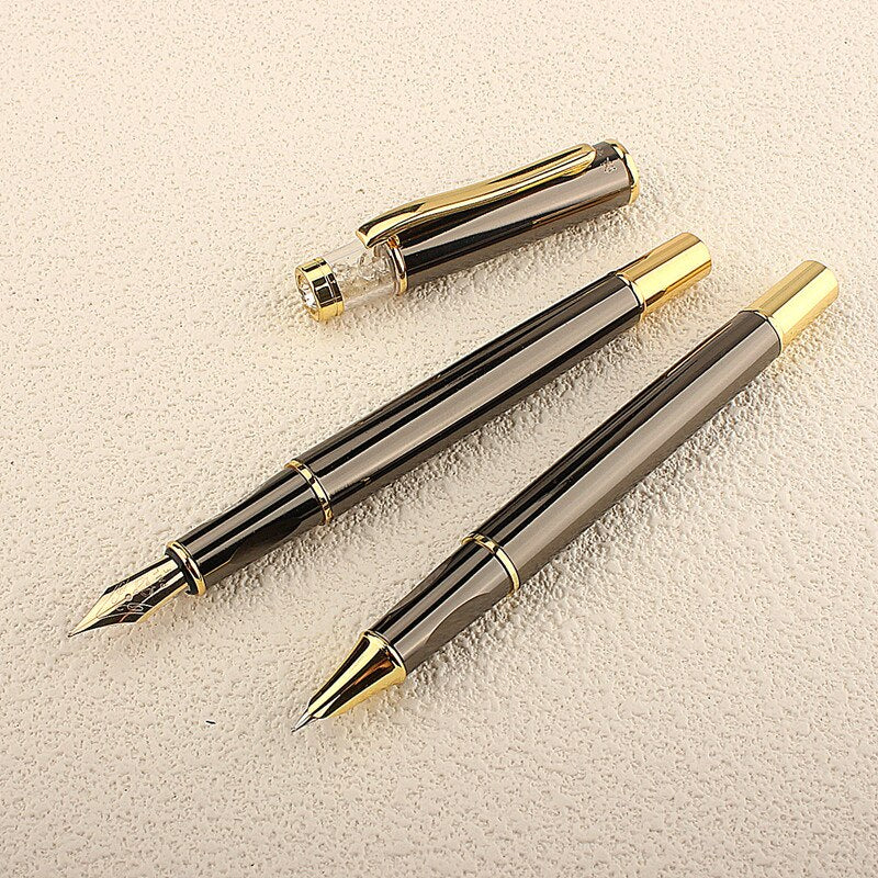 This pen features a grey gun barrel with golden details resembling the night sky stars. The nib is made of high-quality stainless steel and comes in two sizes:
