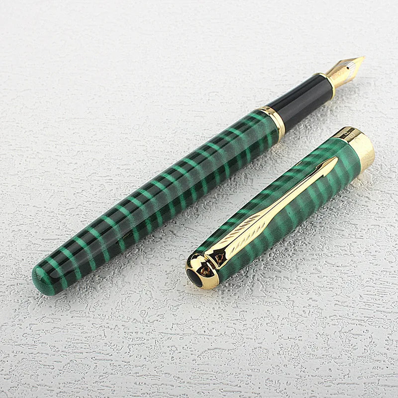 Elevate your writing experience with the Viridian Fountain Pen, featuring a striking green barrel adorned with luxurious gold accents. The pen’s unique striped pattern evokes the natural beauty of viridian gemstones, giving it an aura of sophistication.
